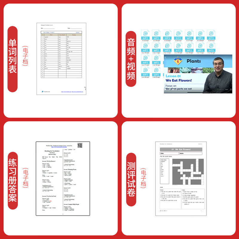 Description(英文描述):Reading for Vocabulary is a set of graded English vocabulary learning resources with complete supporting materials, including textbooks, MP3 audio, FLV/MP4 videos, word lists, comprehension tests and answers. It is divided into four levels: A, B, C and D, which are suitable for learners from upper primary school to junior high school with different English foundations. It focuses on contextual vocabulary learning, combining listening, speaking, reading and testing to help learners accumulate vocabulary in real reading scenarios and improve their comprehensive application ability.