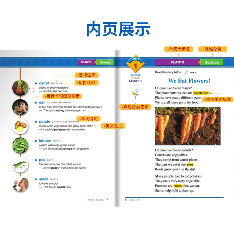 Level A定位为词汇入门,主打基础词汇积累,适配英语零基础或基础薄弱的学习者(小学高年级及以上)。内容围绕日常高频场景展开,课文主题简单易懂,涵盖饮食、动物、感官、季节、能源等贴近生活的话题,比如《We Eat Flowers》《Your Senses》《The Seasons》等,语言浅显,句式简洁,每篇课文聚焦10-15个核心基础词汇,以名词、动词、形容词为主,难度贴合小学英语中高年级水平。配套的音频语速缓慢、发音清晰,适合初学者模仿跟读,帮助熟悉词汇发音与语境;课程视频画面生动,多为动画或实景展示,搭配简单讲解,降低入门难度,同时配套单词表、理解测试及答案,方便学习者及时巩固、检验学习效果。