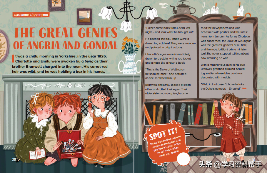 Storytime又被称为童话宝藏,虽然这是一套为孩子准备的故事杂志,但是它也是一本冒险杂志,每一期杂志都会在第4页为孩子们呈现这期杂志的冒险之旅。为了完成这些好玩的冒险,孩子会让自己沉浸在故事里,去发现、去探索那些故事里的细节。