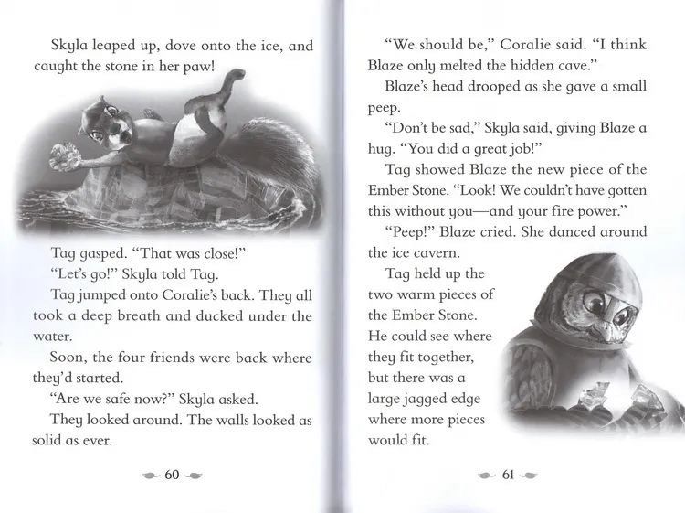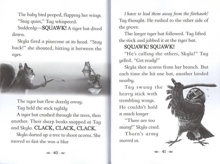 - 情节发展:三位主人公——猫头鹰Tag、松鼠Skyla和最后的火鹰Blaze——要穿越布满危险和追兵的森林、沼泽和被黑暗魔法笼罩的阴影地带,与时间赛跑,赶在黑魔法完全笼罩佩罗迪亚之前集齐隐藏的魔法石。整个系列以生动的语言描述和紧张惊险的情节发展,为孩子带来新鲜刺激的阅读体验。