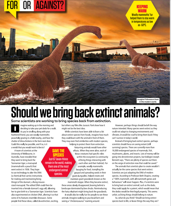 由于我本人是“猫奴”,在看到宠物猫相关的文章时,连我这个成年人都被里面的内容吸引到了。文章讲诉了人类历史上第一只宠物猫是何时出现的,以及宠物猫的出现究竟是动物自身的进化还是人类的“圈养”导致的,非常有意思。不止于此,杂志里还涉及很多颇具哲思意义观点的探讨。举个例子,在最新一期(2022年9月刊)杂志里,有一篇文章叫做“Should we bring back extinct animals?"(人类应该要让那些已经灭绝的动物“复活”吗?)