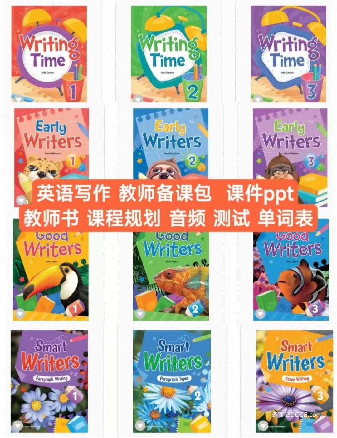 配套资源方面,Good Writers 同样提供了学生用书(含练习册)、音频、PPT课件、教案、测试卷、单词表和答案,配置完整。