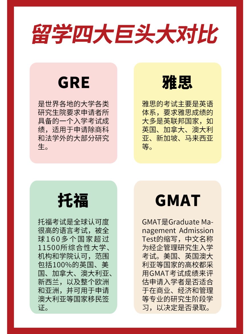 | 适配专业 | 适配绝大多数研究生专业,包括文科、理科、工科、社科(除商科、法学、医学特定专业外),适用范围最广 | 仅适配商科专业(如MBA、金融、会计等),部分商科院校也接受GRE成绩 | 仅适配法学专业(JD),是法学留学的核心考试,部分院校不接受GRE替代 | 仅适配医学相关专业(如临床医学、公共卫生等),是医学留学的必备考试 |